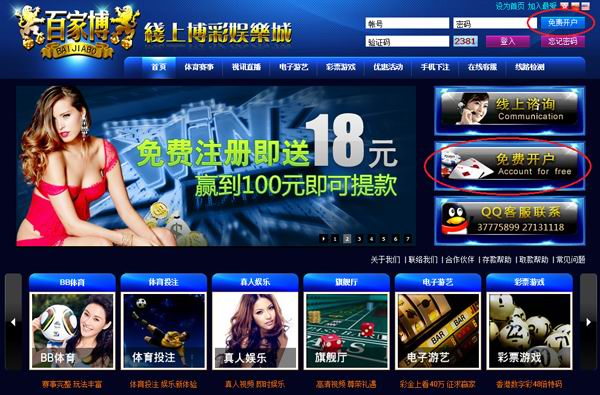 2、点选百家博娱乐城首页右侧顶部或右侧中间之“免费开户” 按钮